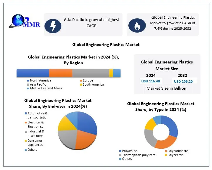 Anticipated Growth in Revenue: Global Engineering Plastics Market size was valued at USD 116.48 Bn. in 2024 and the total Global Engineering Plastics Market revenue is expected to grow at a CAGR of 7.4% from 2025 to 2032, reaching nearly USD 206.20 Bn. by 2032.