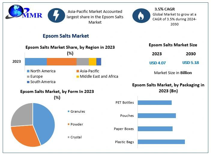 The Epsom Salts Market is expected to witness stable growth through 2030, supported by increasing awareness of magnesium-based health benefits and expanding applications across diverse industries. With projected revenue reaching nearly USD 5.18 Billion and a CAGR of 3.5%, the market offers promising opportunities for manufacturers, suppliers, and investors.