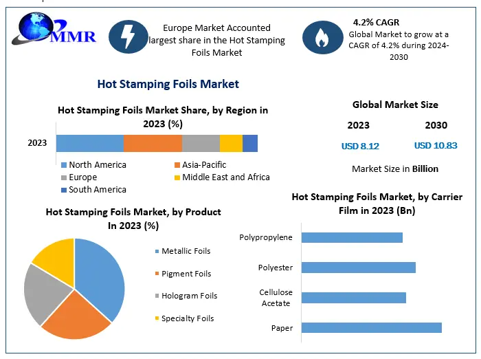 Hot Stamping Foils Market was valued at US$ 8.12 Bn in 2023 and is expected to reach US$ 10.83 Bn by 2030 at a CAGR of 4.2% during the forecast period.