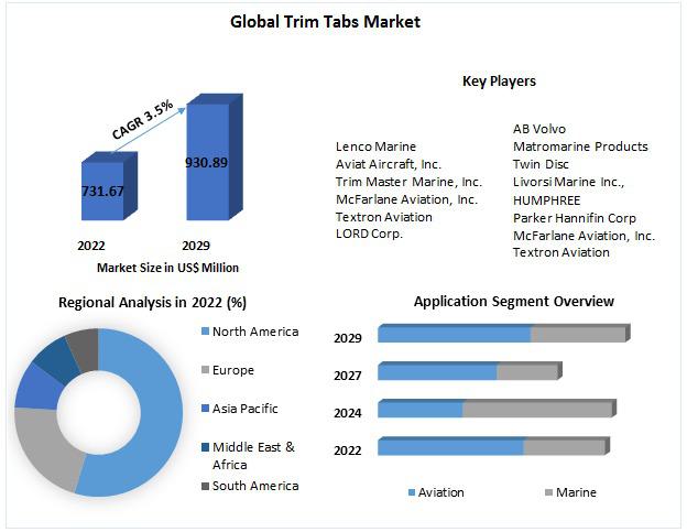 Anticipated Growth in Revenue: The Trim Tabs Market was valued at US$ 731.67 Mn. in 2022. Global Trim Tabs Market size is expected to grow at a CAGR of 3.5 % through the forecast period.