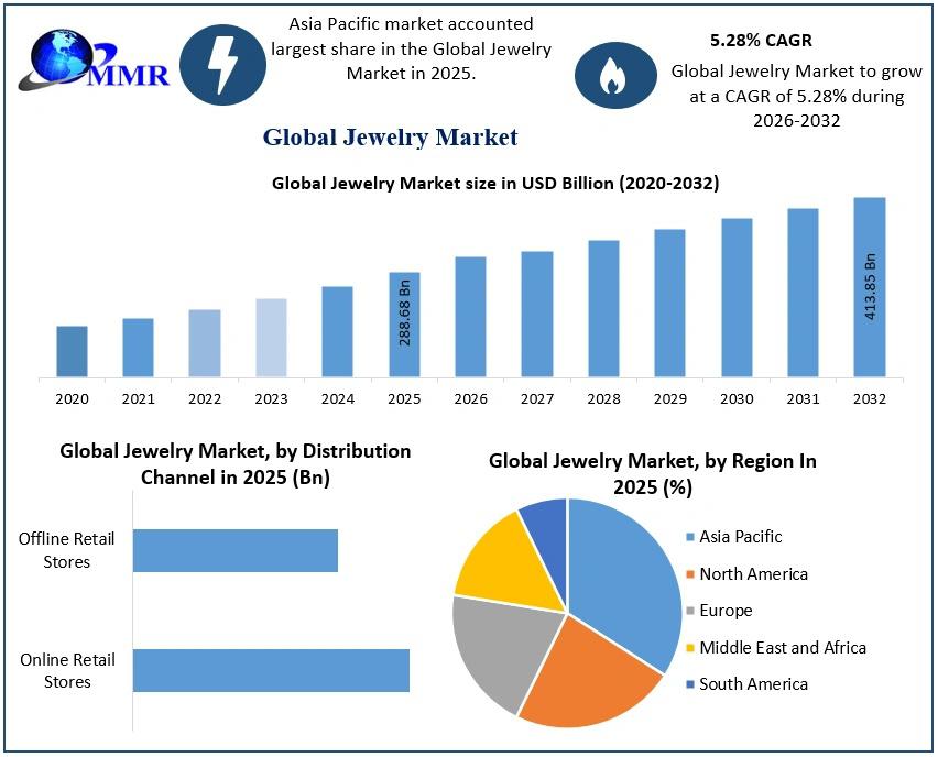 The global Jewelry Market is witnessing steady expansion driven by increasing disposable incomes, fashion trends, and demand for luxury accessories. The market was valued at USD 288.68 billion in 2025 and is projected to reach approximately USD 413.85 billion by 2032, growing at a CAGR of around 5.28% during 2026–2032.